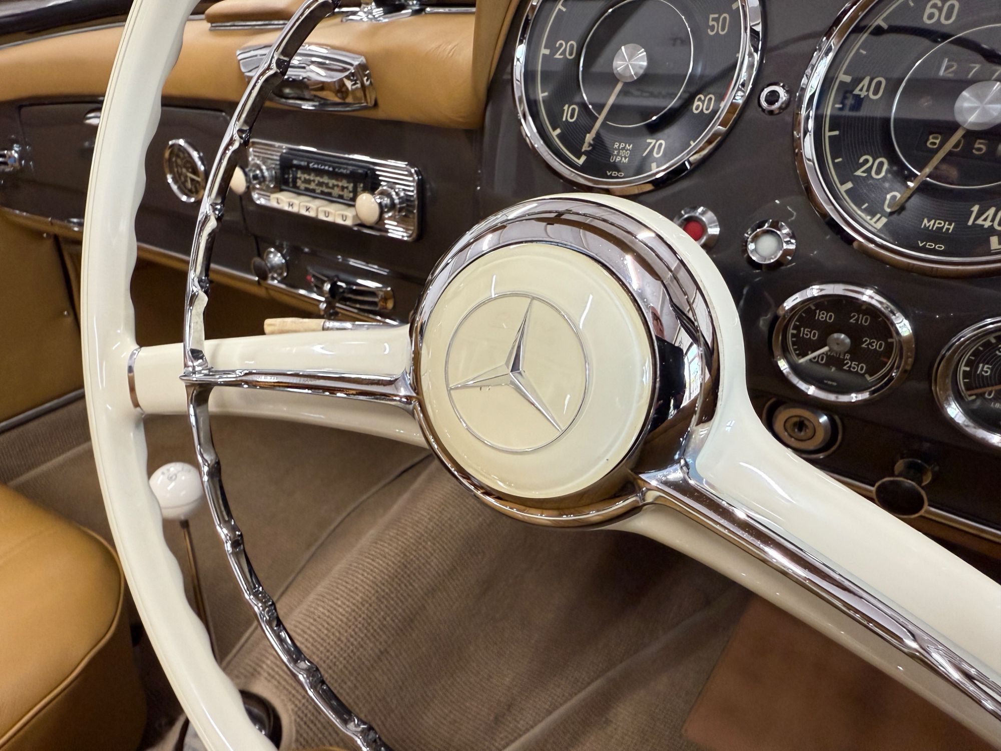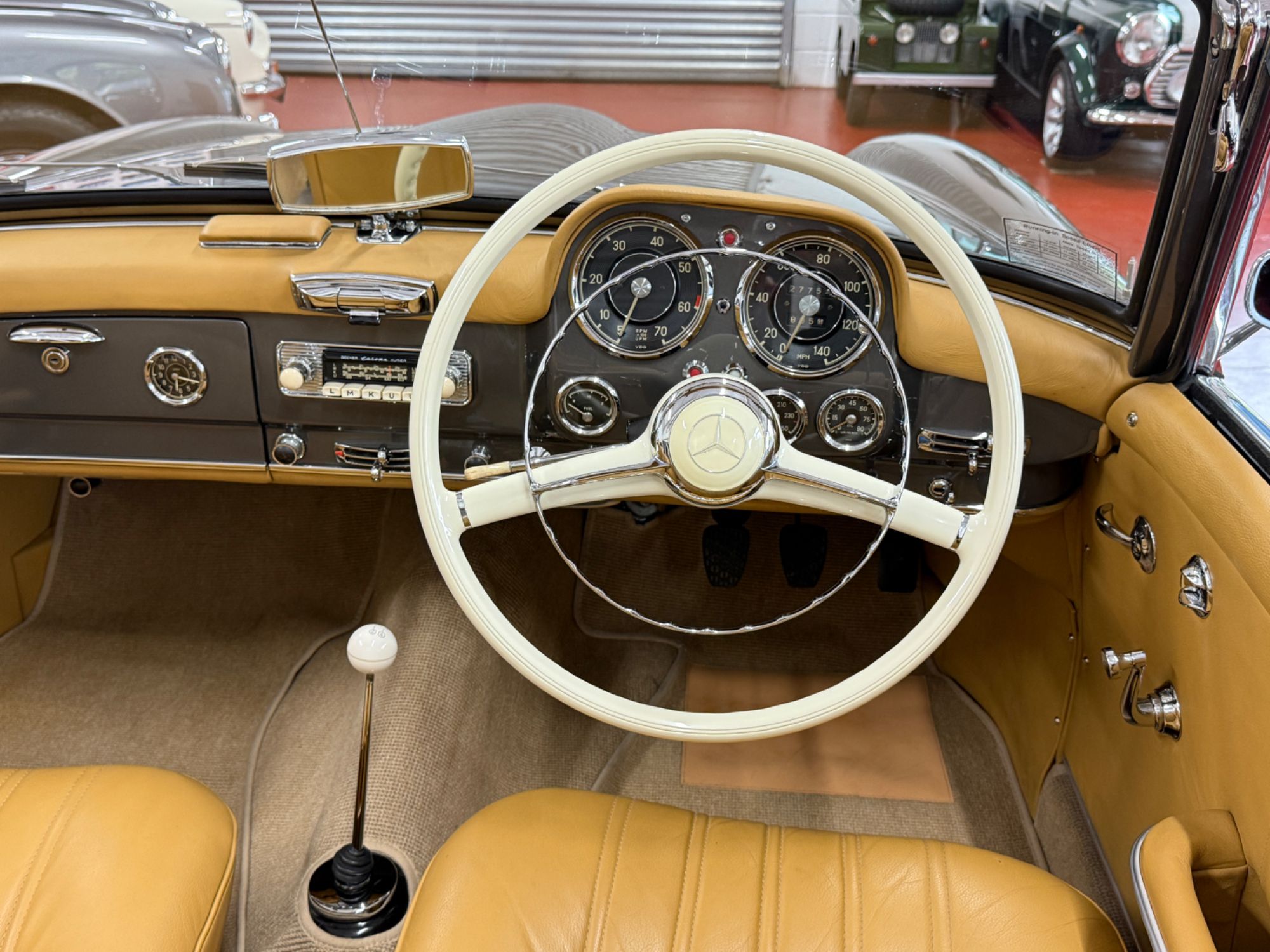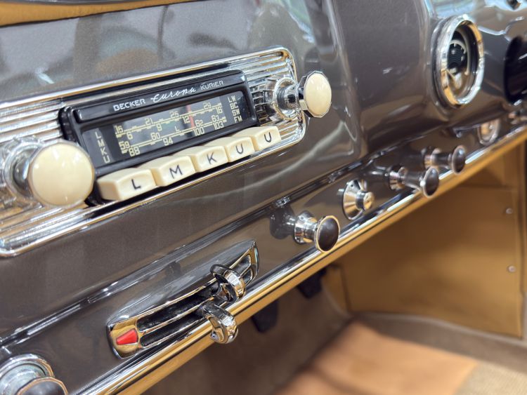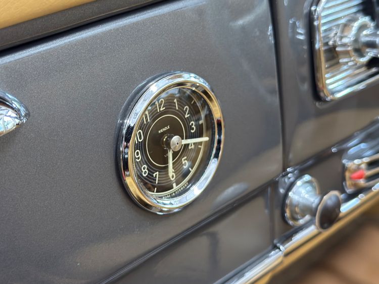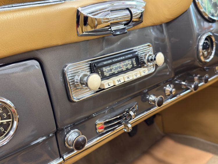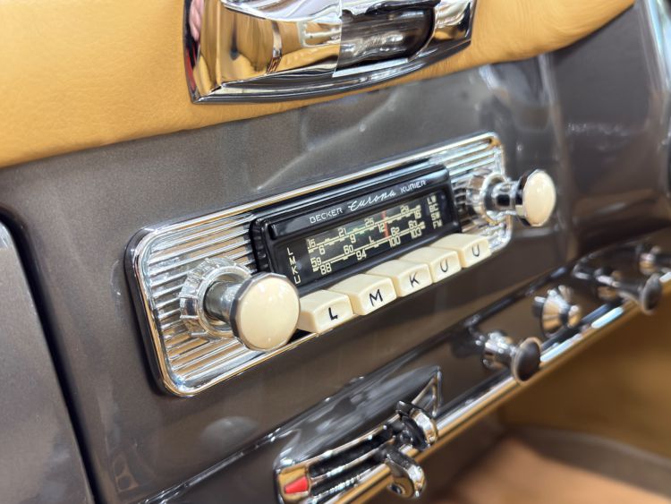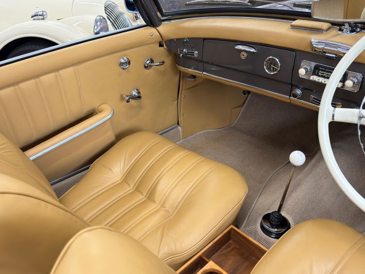 The dashboard has been fully restored, Tan leather top dash with body colour facia, locking glovebox lined in leather and inset analogue clock, fully rebuilt crystal clear VDO instruments, new switches and chrome work, Becker Europa Kurier radio, all electrics work as they were intended. The Ivory chrome ring steering wheel with Mercedes centre boss presents as new. Individually controlled heating and ventilation system...