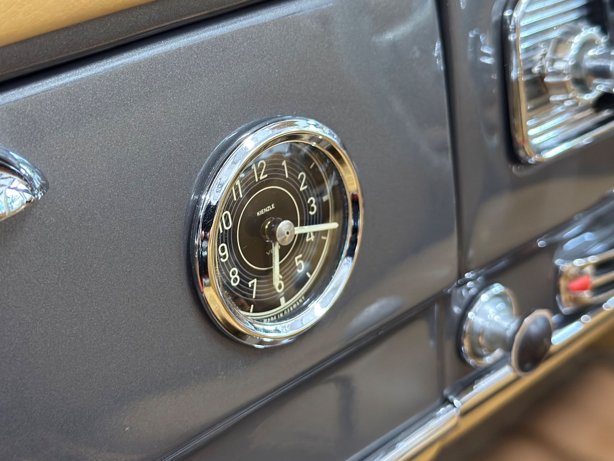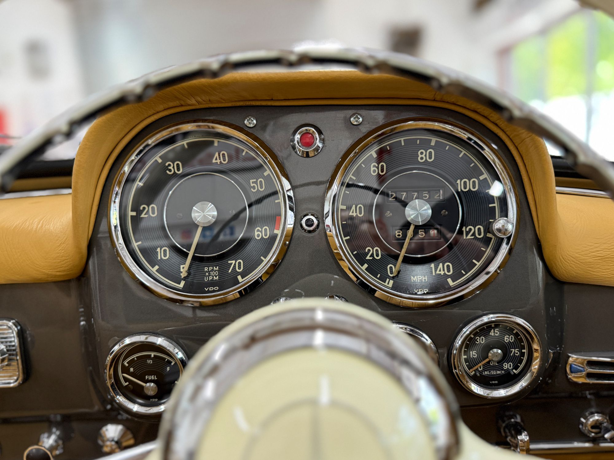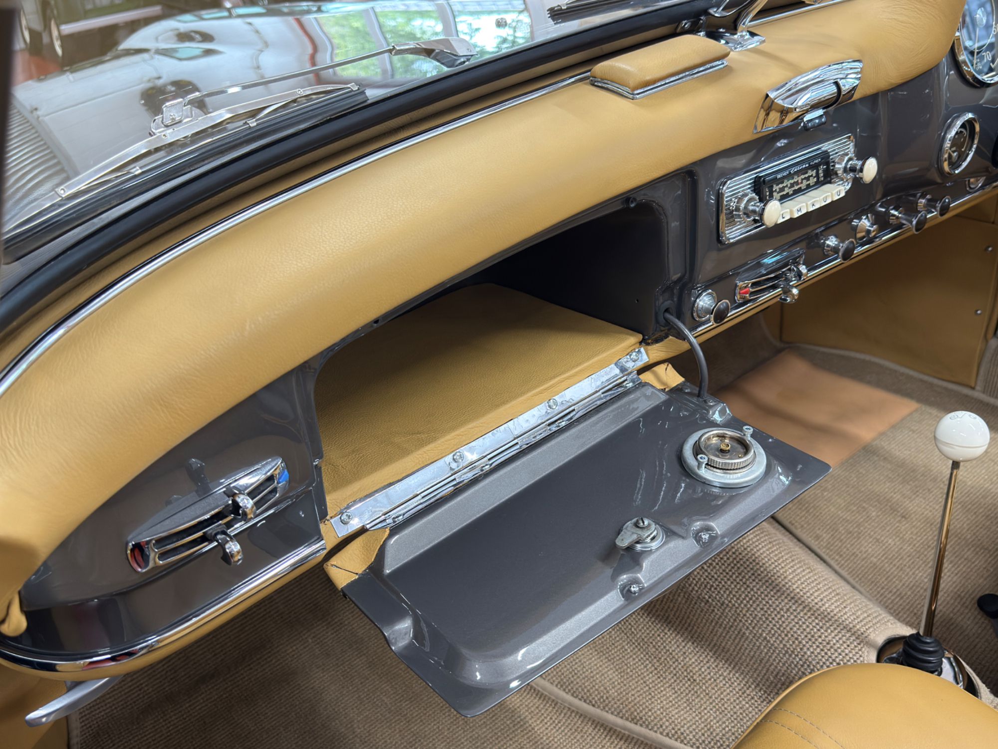 The dashboard has been fully restored, Tan leather top dash with body colour facia, locking glovebox lined in leather and inset analogue clock, fully rebuilt crystal clear VDO instruments, new switches and chrome work, Becker Europa Kurier radio, all electrics work as they were intended. The Ivory chrome ring steering wheel with Mercedes centre boss presents as new. Individually controlled heating and ventilation system...