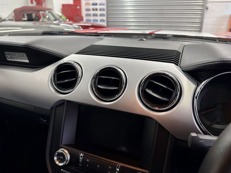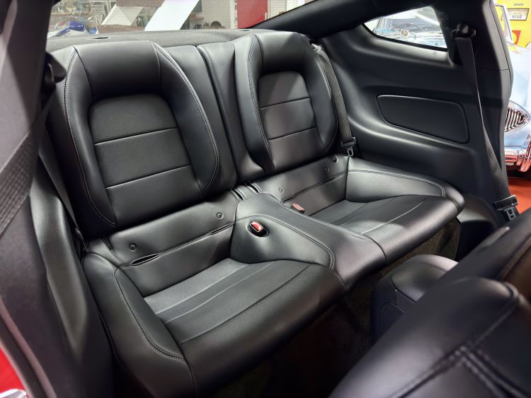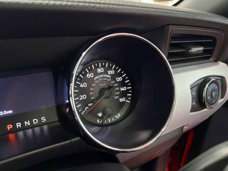 Inside, the 5.0 V8 GT Fastback , you will be presented with a blend of premium materials, cutting edge technology and signature retro styling cues from the 1960's. Large round gauges, a prominent double-brow dashboard and aviation-inspired toggle switches, and a 3-spoke leather steering wheel.