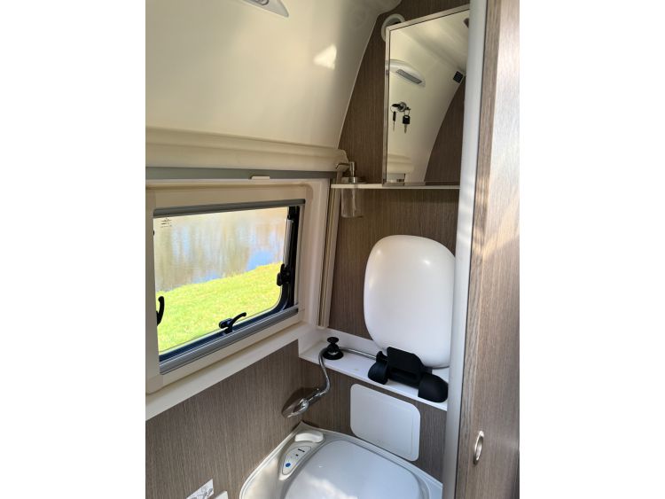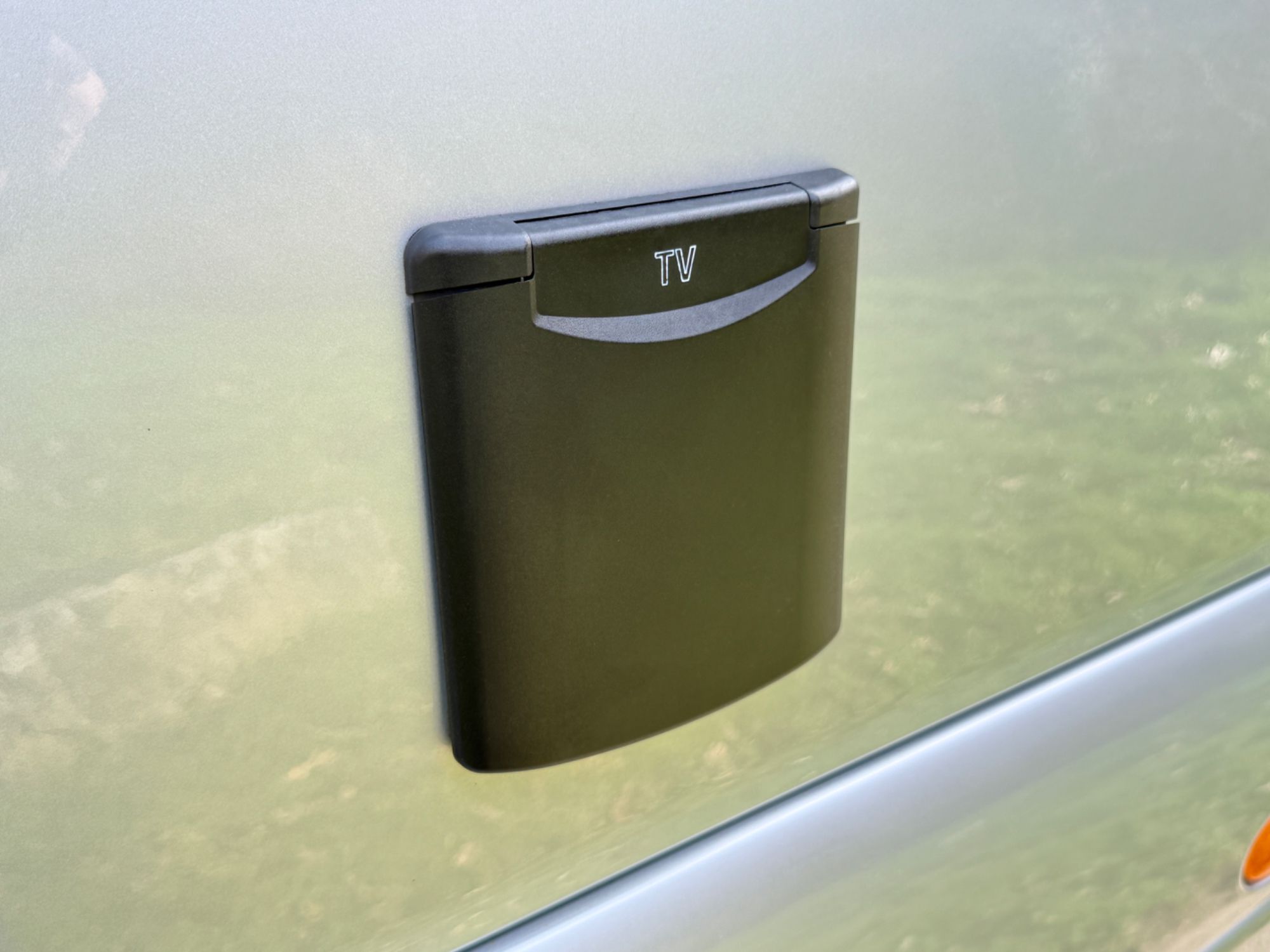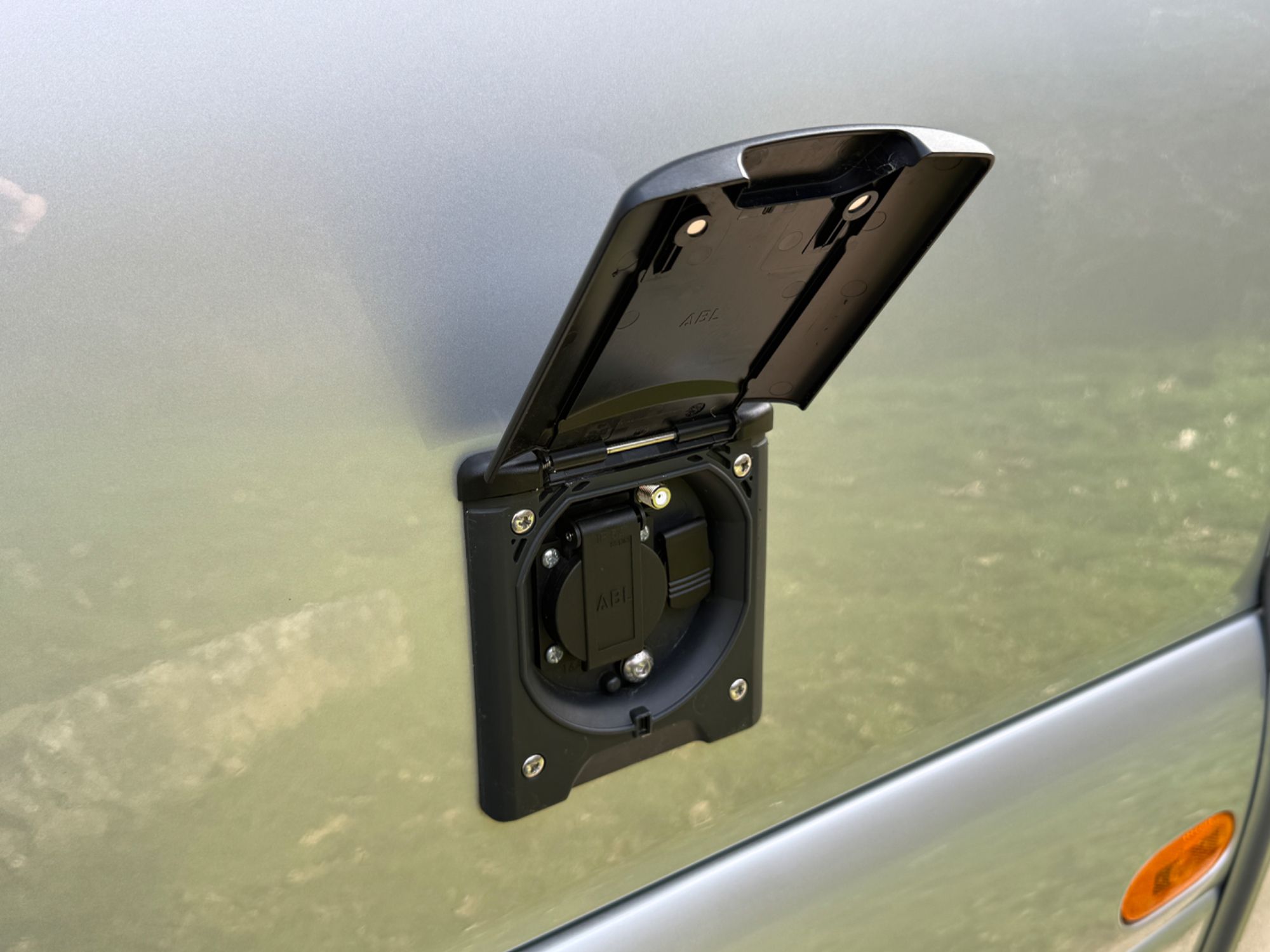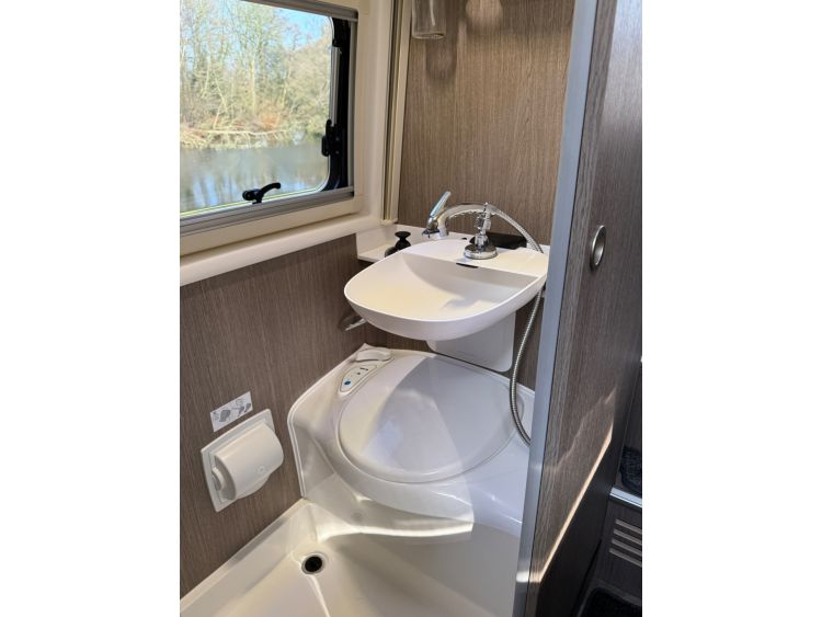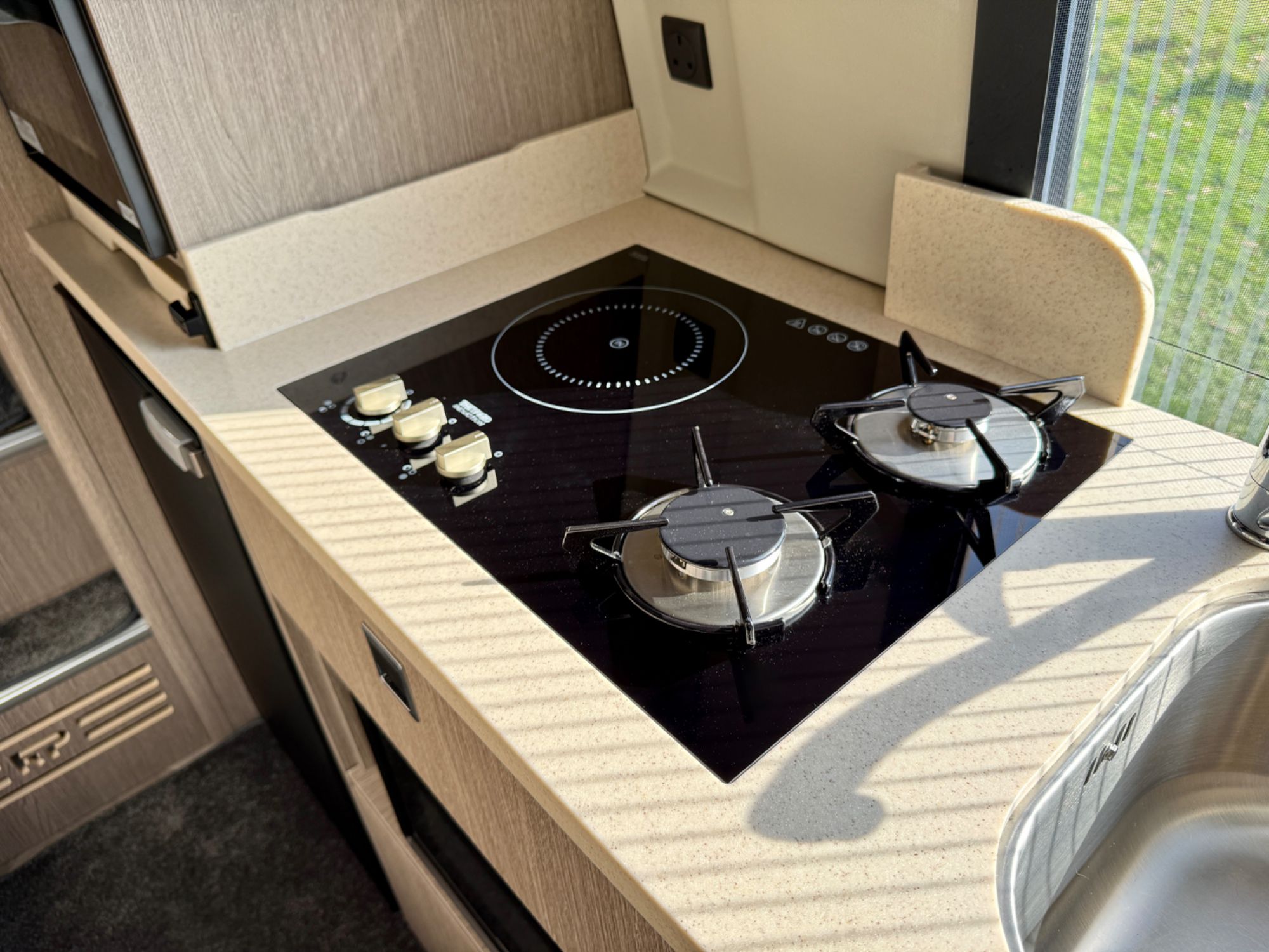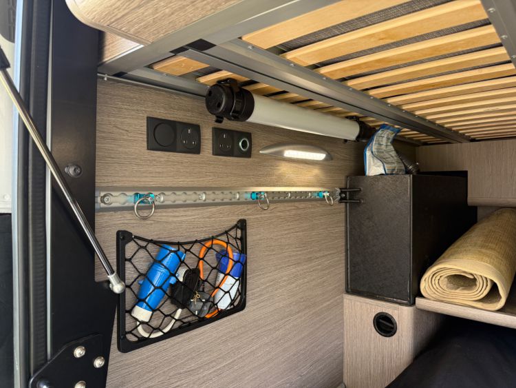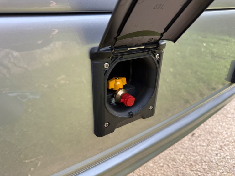 Twin fresh water fill points, gas fill point, external BBQ socket, external power socket, TV ariel point, door flyscreen, Thule 4.5 metre electric awning, awing strip light, Thule electric step, up and over rear garage door.