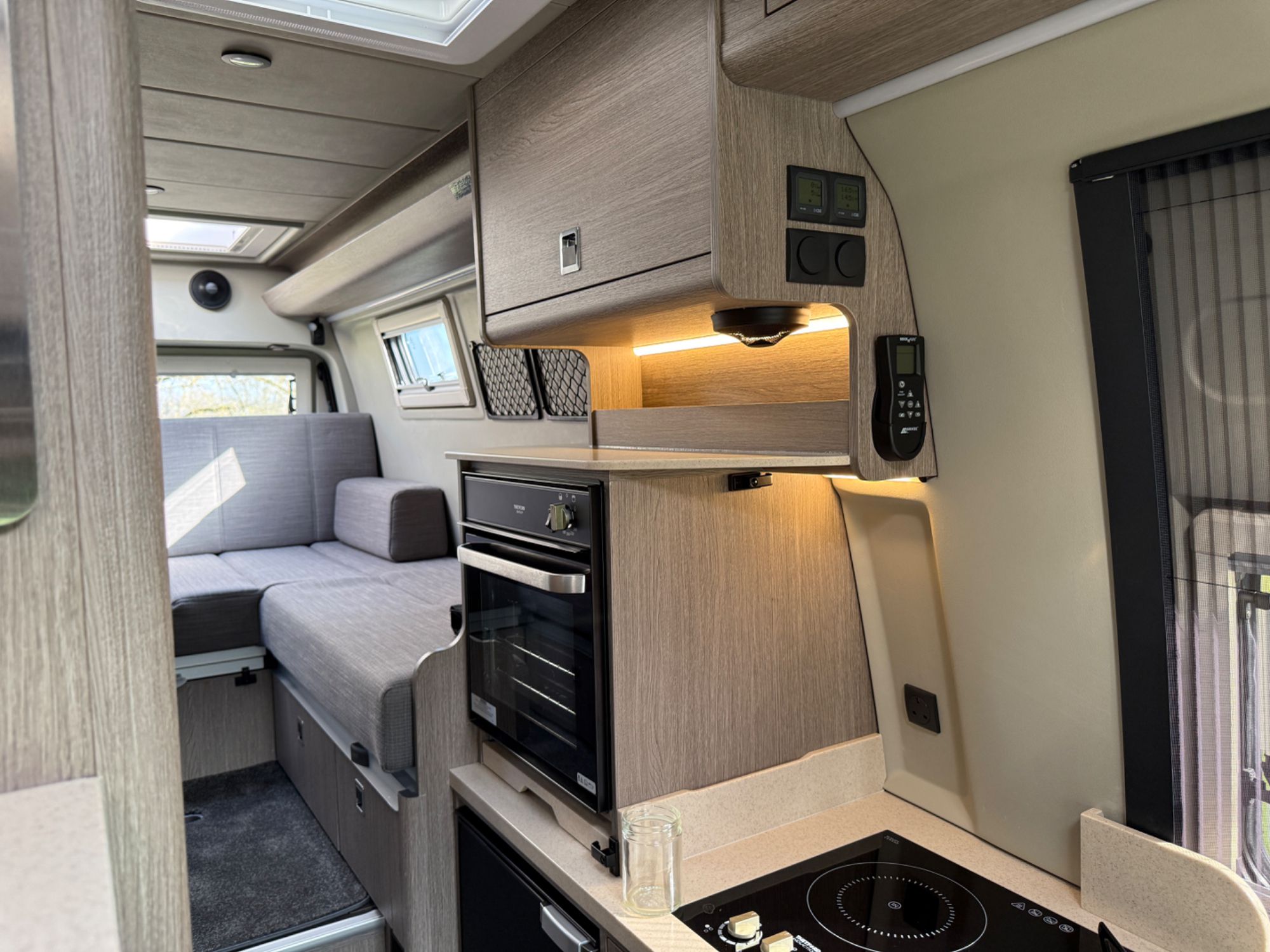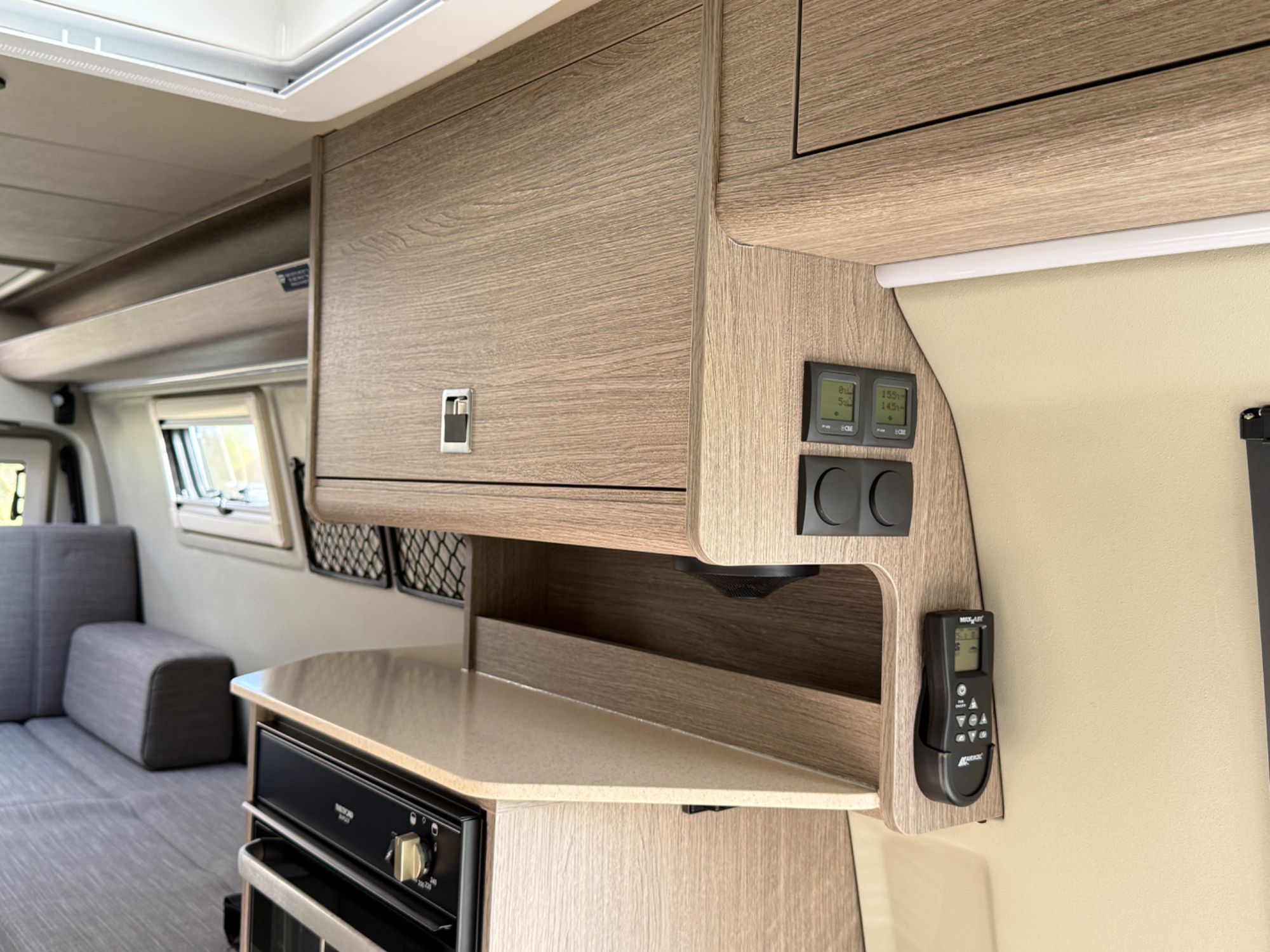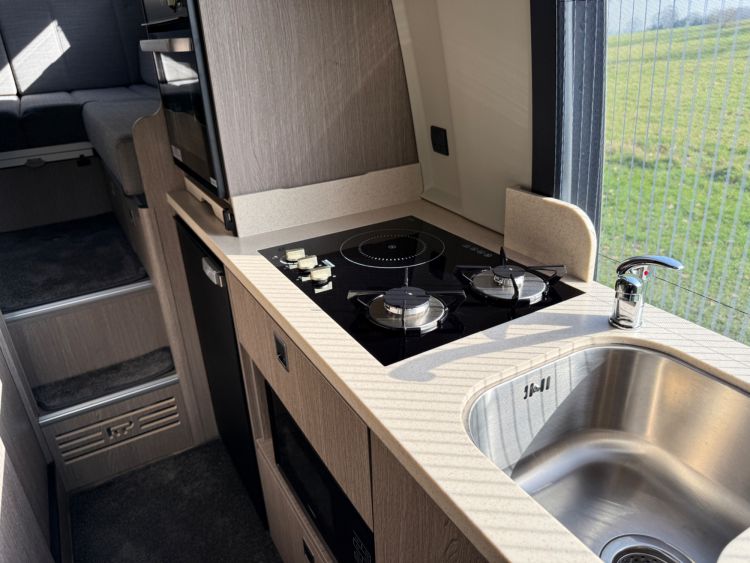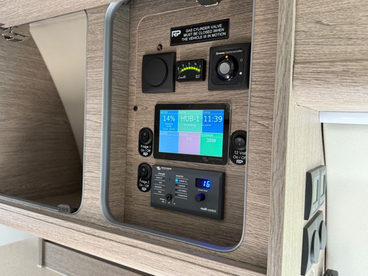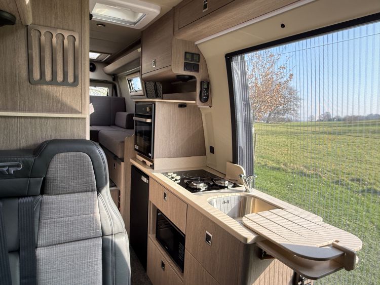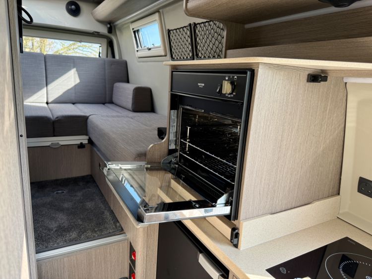 Kitchen Area... DuPont Corian worktops, soft close drawers, multiple pivot table layouts, 2 sets of removable carpets, Thetford Topline 981 dual gas/induction hob, Thetford Duplex gas oven / grill, 12v Maxxfan Deluxe roof fan, Truma Habitation Air Conditioning - £2695, Dometic MEO 240 Microwave - £295, Vitrifrigo 33 Litre Beer Fridge - £1400, Vitrifrigo C85i 85 litre compressor fridge/freezer, Cerbo GX touchscreen control panel, digital safe and additional cabin bed.