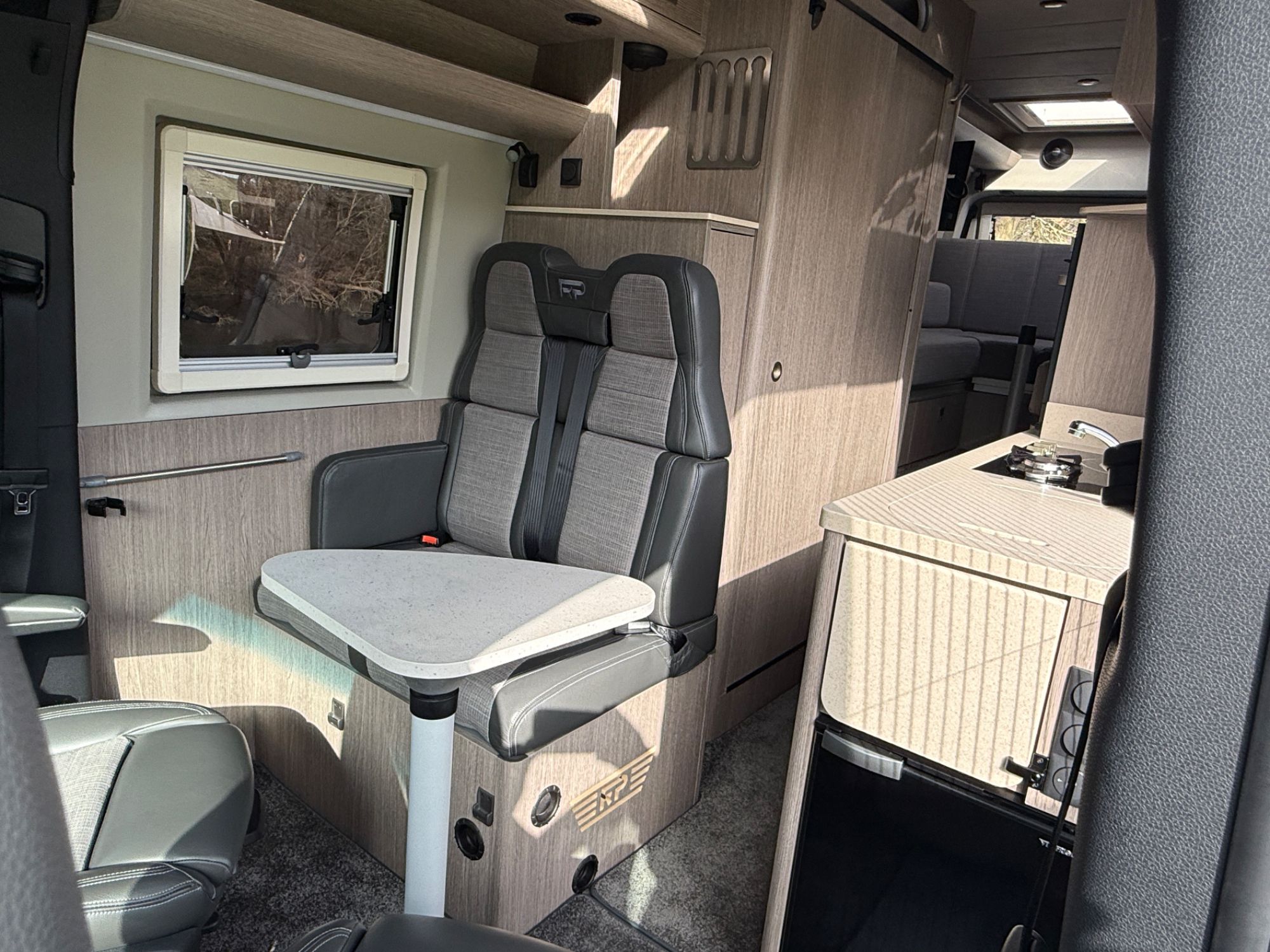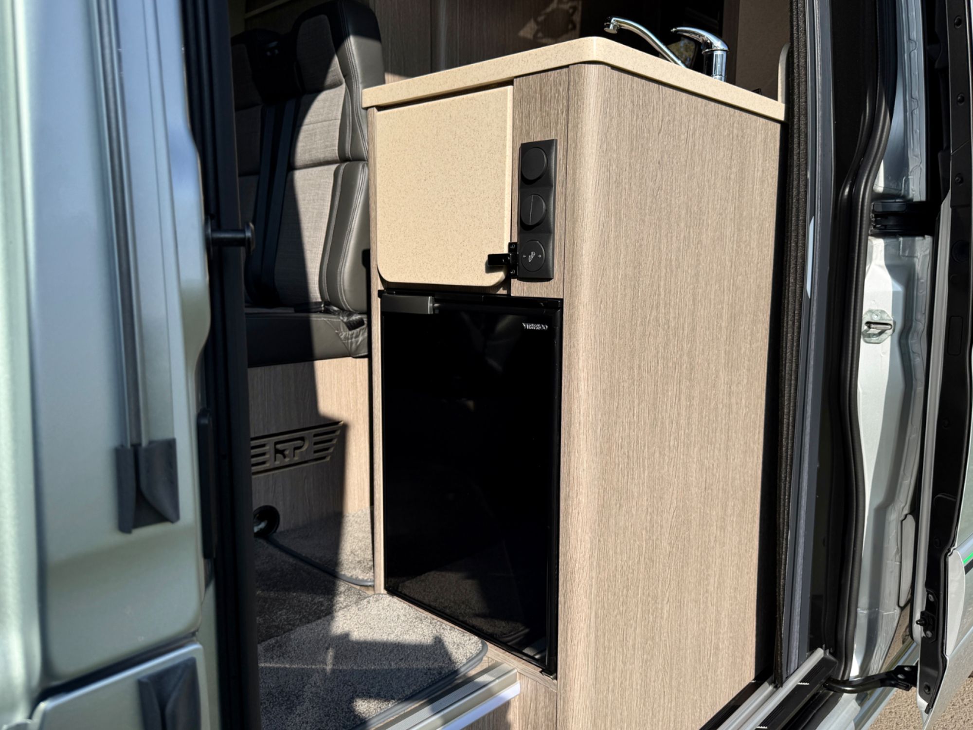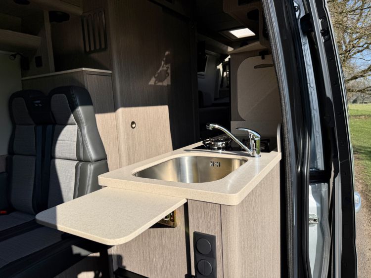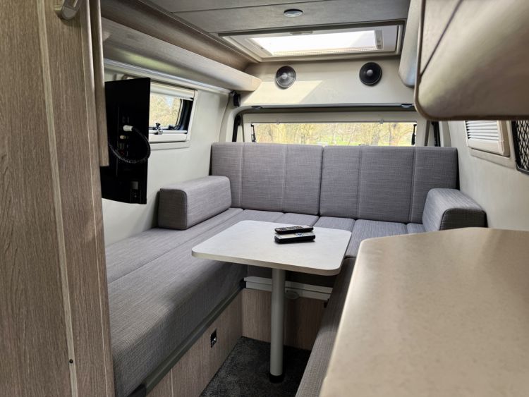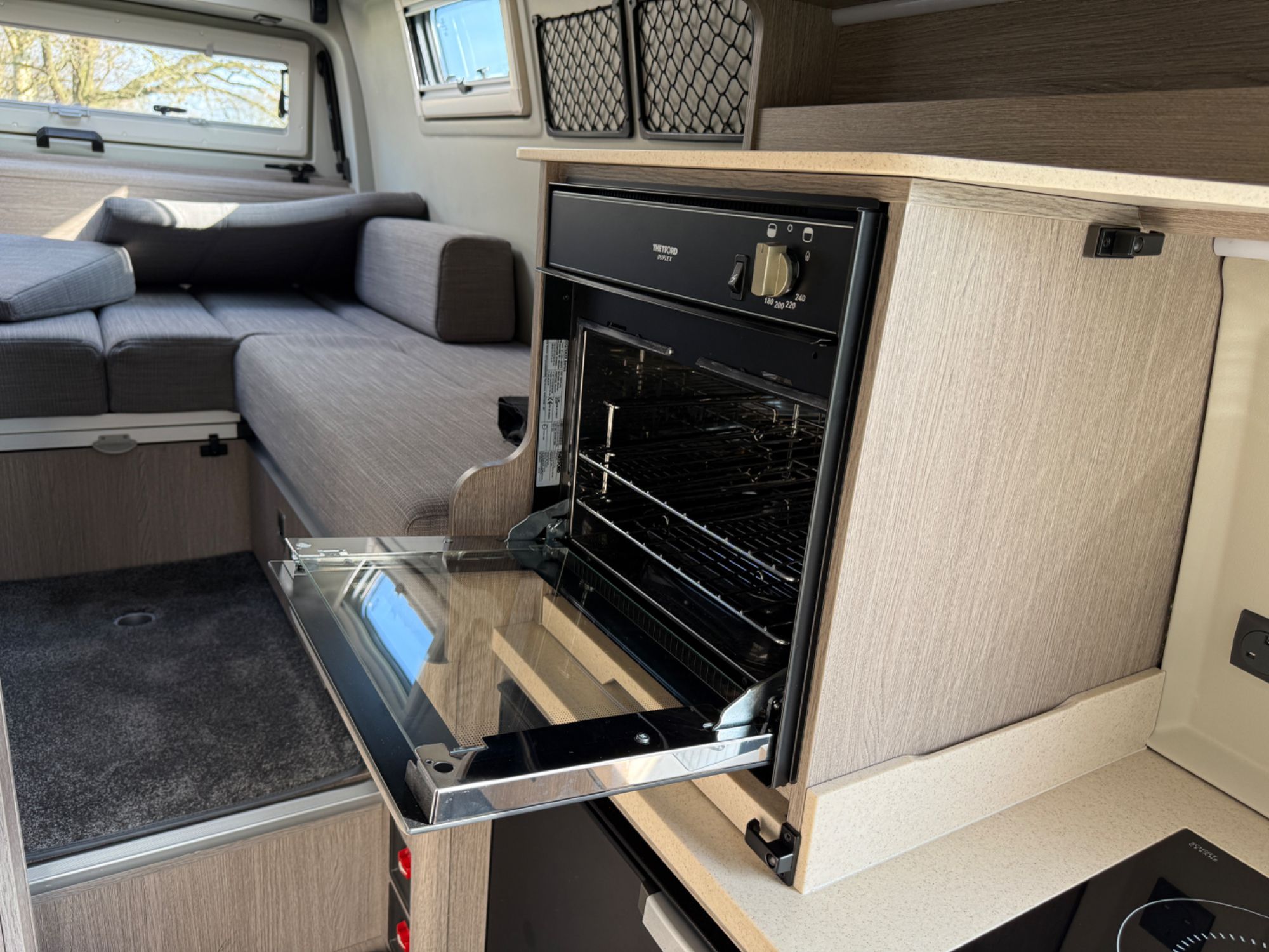 Kitchen Area... DuPont Corian worktops, soft close drawers, multiple pivot table layouts, 2 sets of removable carpets, Thetford Topline 981 dual gas/induction hob, Thetford Duplex gas oven / grill, 12v Maxxfan Deluxe roof fan, Truma Habitation Air Conditioning - £2695, Dometic MEO 240 Microwave - £295, Vitrifrigo 33 Litre Beer Fridge - £1400, Vitrifrigo C85i 85 litre compressor fridge/freezer, Cerbo GX touchscreen control panel, digital safe and additional cabin bed.