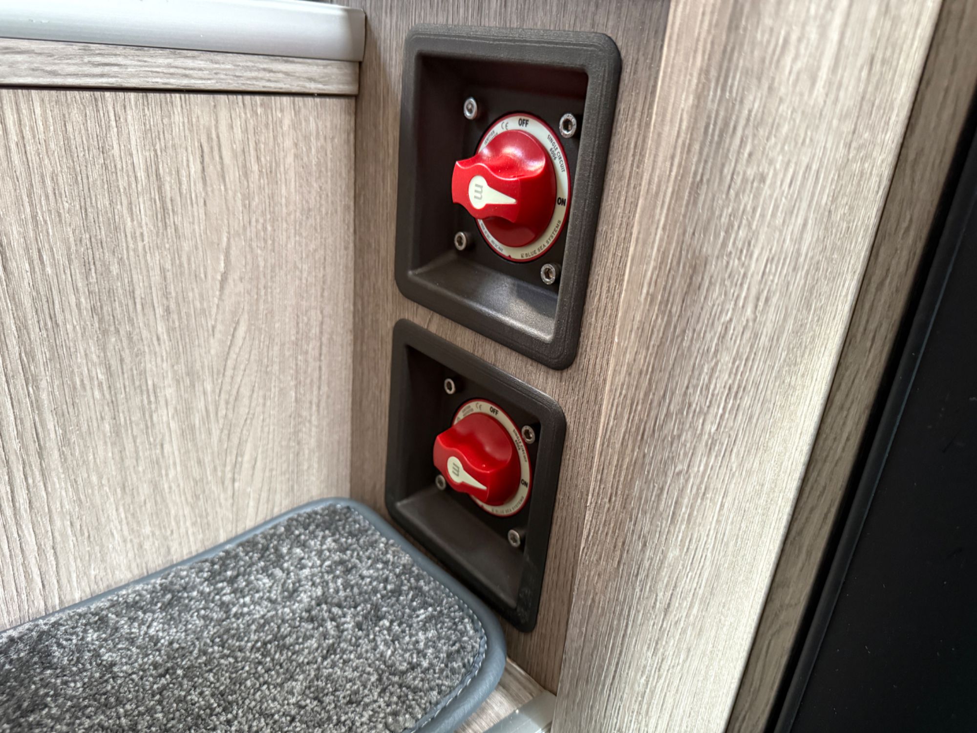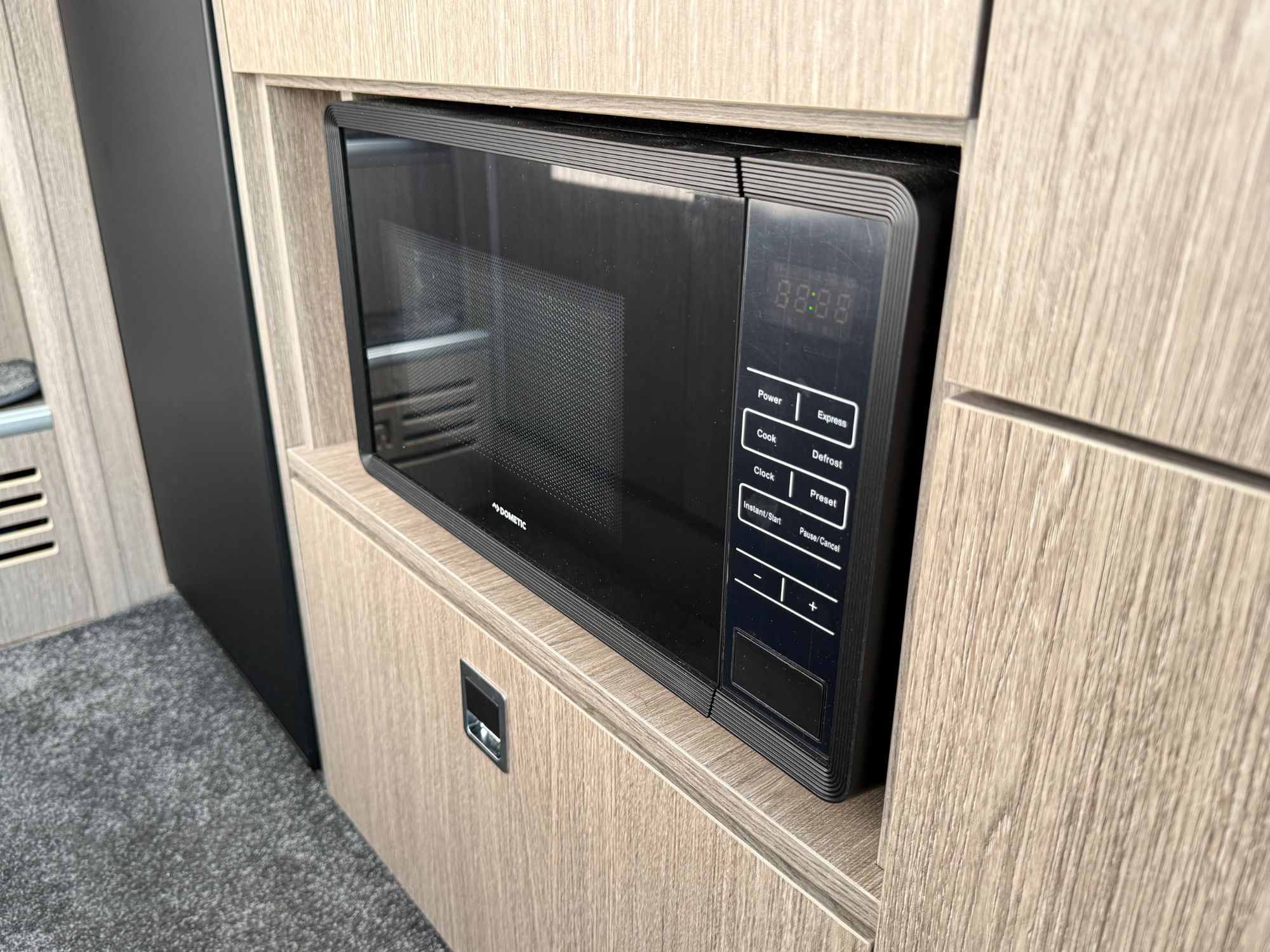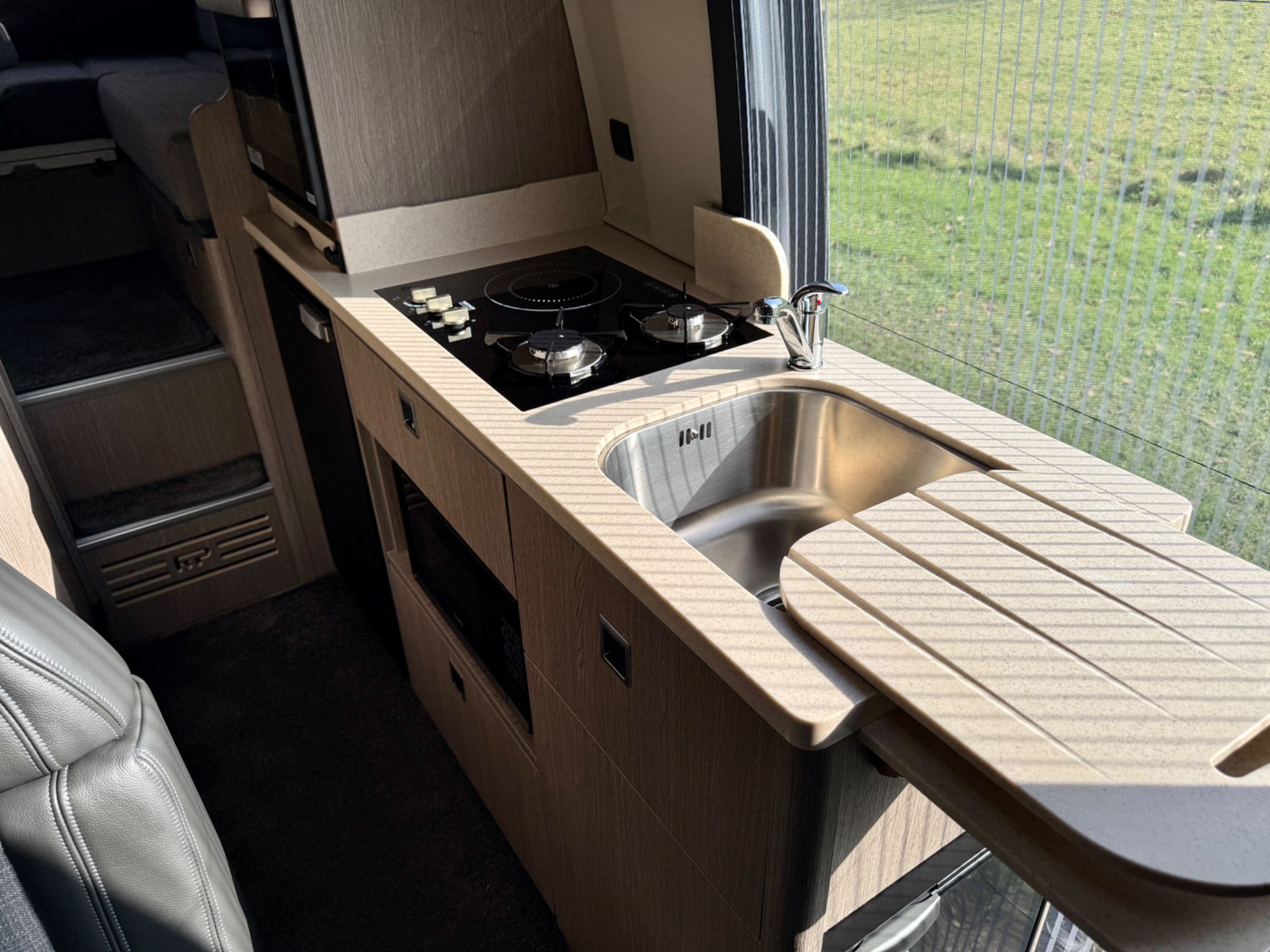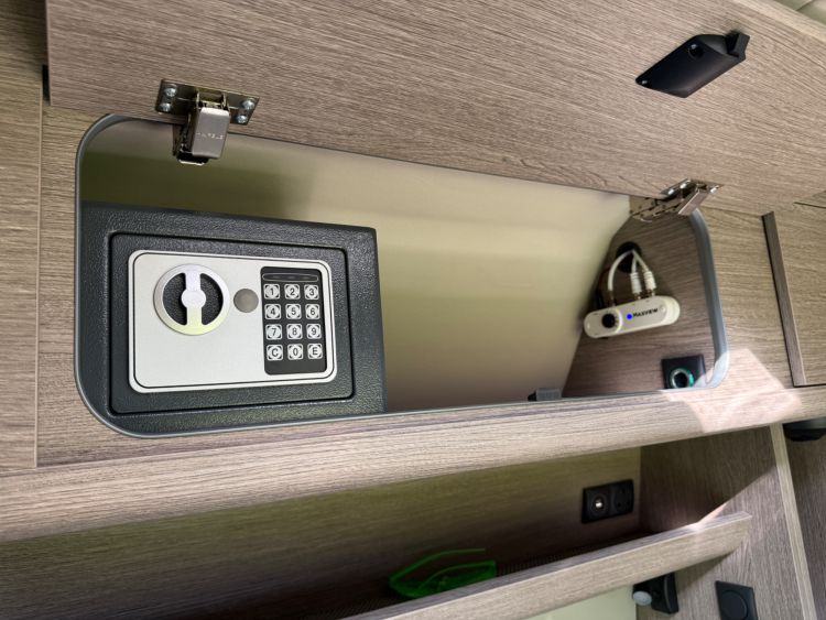 Kitchen Area... DuPont Corian worktops, soft close drawers, multiple pivot table layouts, 2 sets of removable carpets, Thetford Topline 981 dual gas/induction hob, Thetford Duplex gas oven / grill, 12v Maxxfan Deluxe roof fan, Truma Habitation Air Conditioning - £2695, Dometic MEO 240 Microwave - £295, Vitrifrigo 33 Litre Beer Fridge - £1400, Vitrifrigo C85i 85 litre compressor fridge/freezer, Cerbo GX touchscreen control panel, digital safe and additional cabin bed.