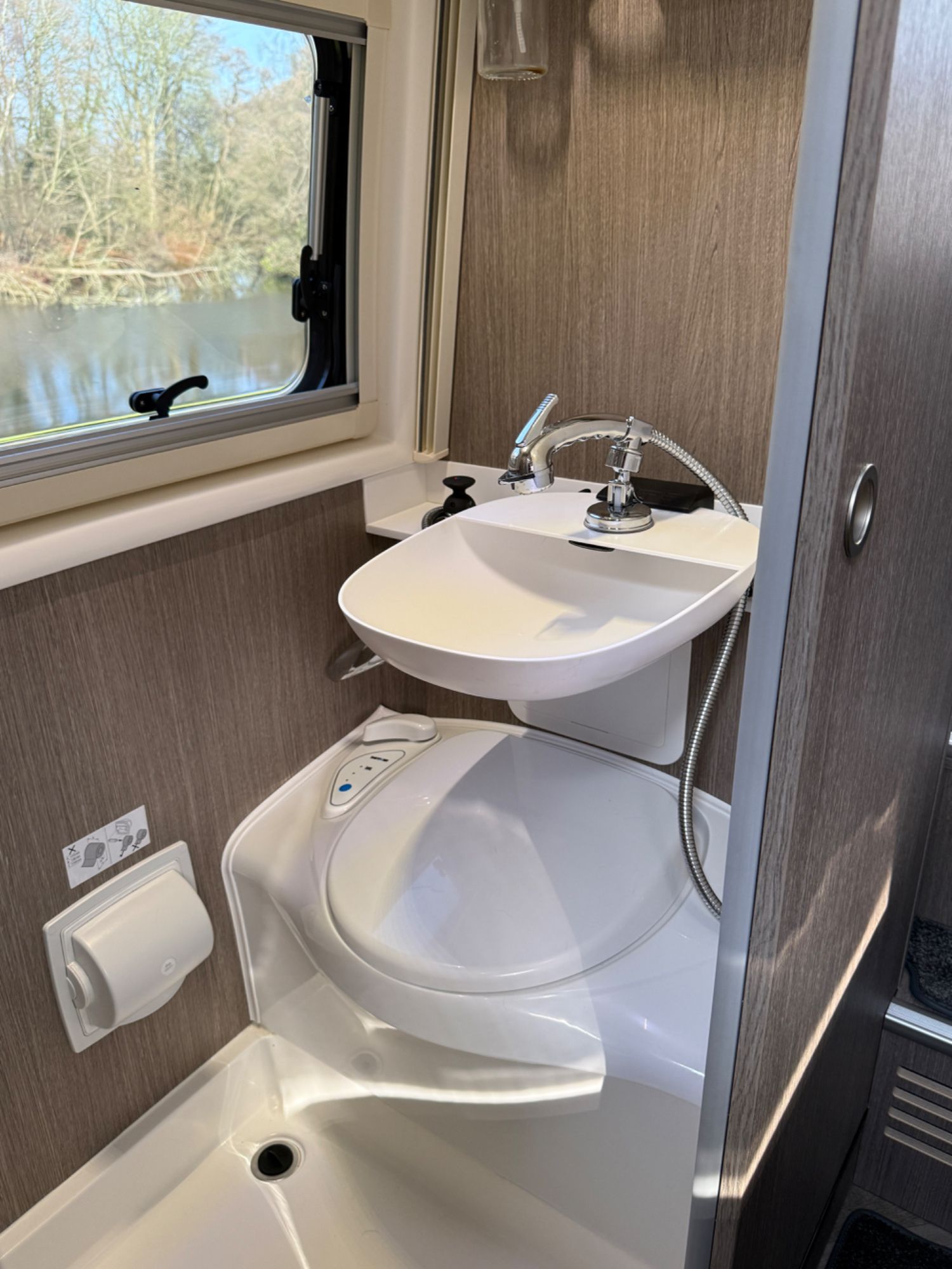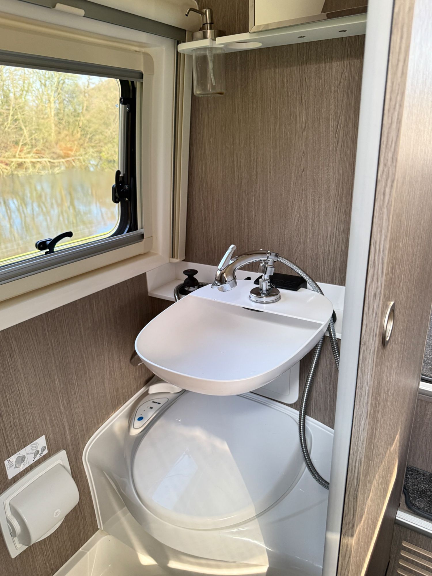 Bathroom... Bi-fold shower screen, GRP durable shower tray and chrome mixer taps, DuPont Corian tops with GRP drop down sink and stainless lockable mirror cabinet, soap dispenser , heater outlet, and LED lighting.