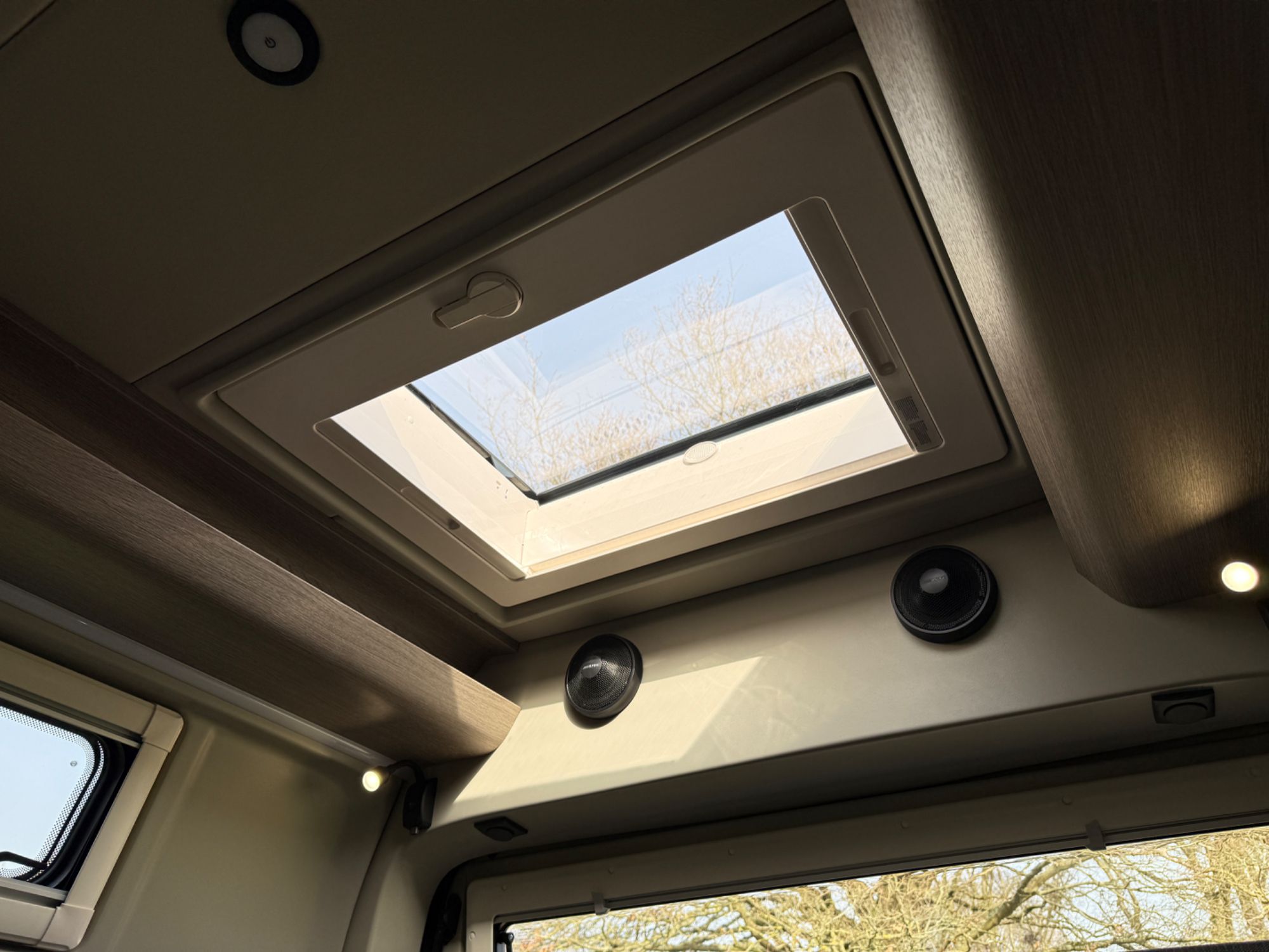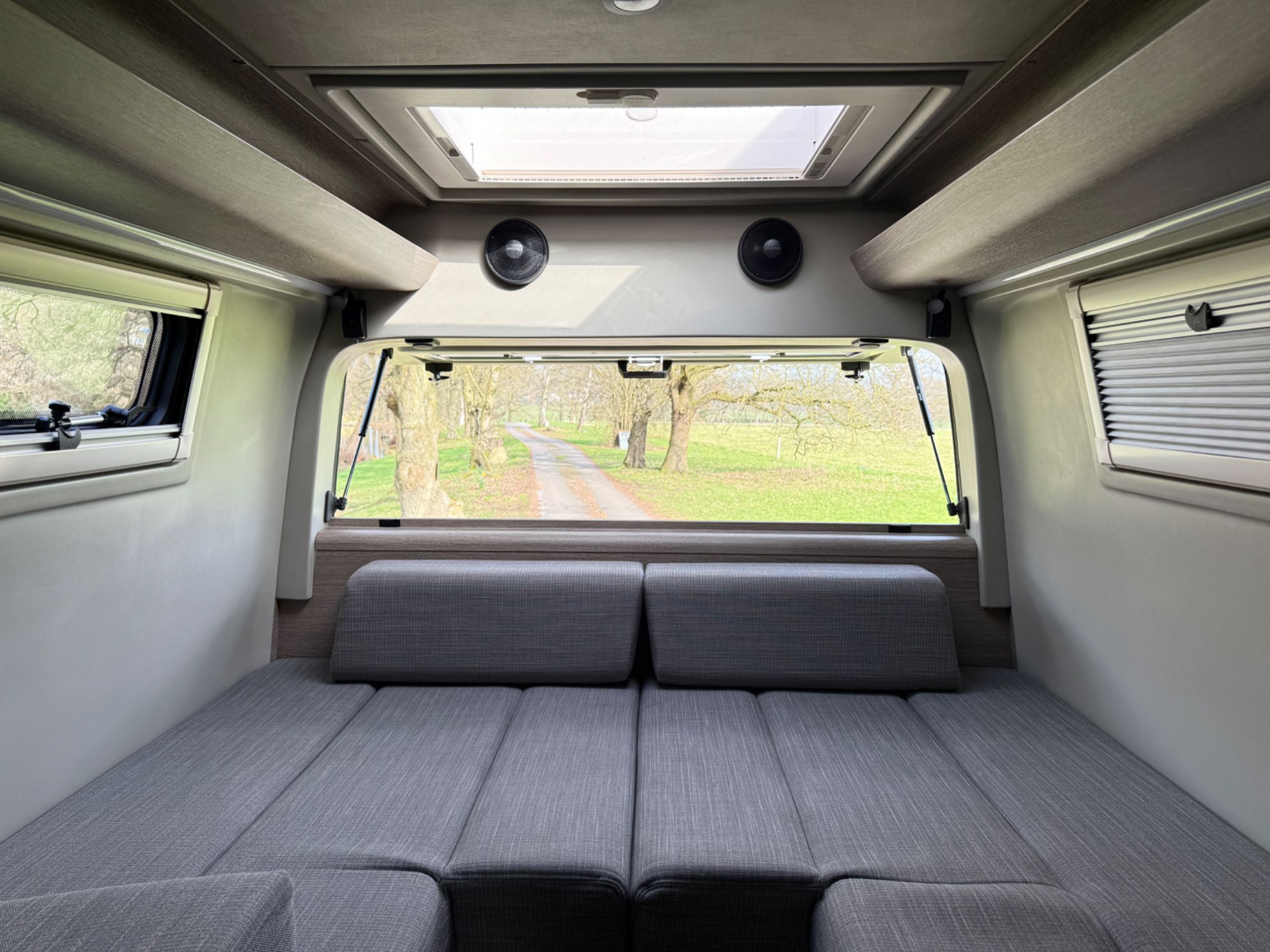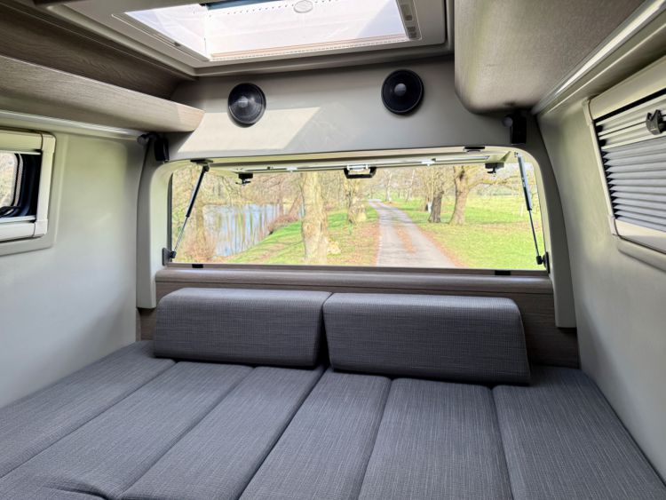 Elevated Rear Lounge... Providing the perfect cosy retreat with the optional full-width up and over opening rear door £1792, LED ceiling & dimmable reading lights, AVTEX L219 DRS-Pro 21-inch TV/DVD/Satellite with omnidirectional Maxview Gazelle Pro booster aerial, Alpine sound system, multi-configuration sofa/beds trimmed in fine grade leather/fabric.