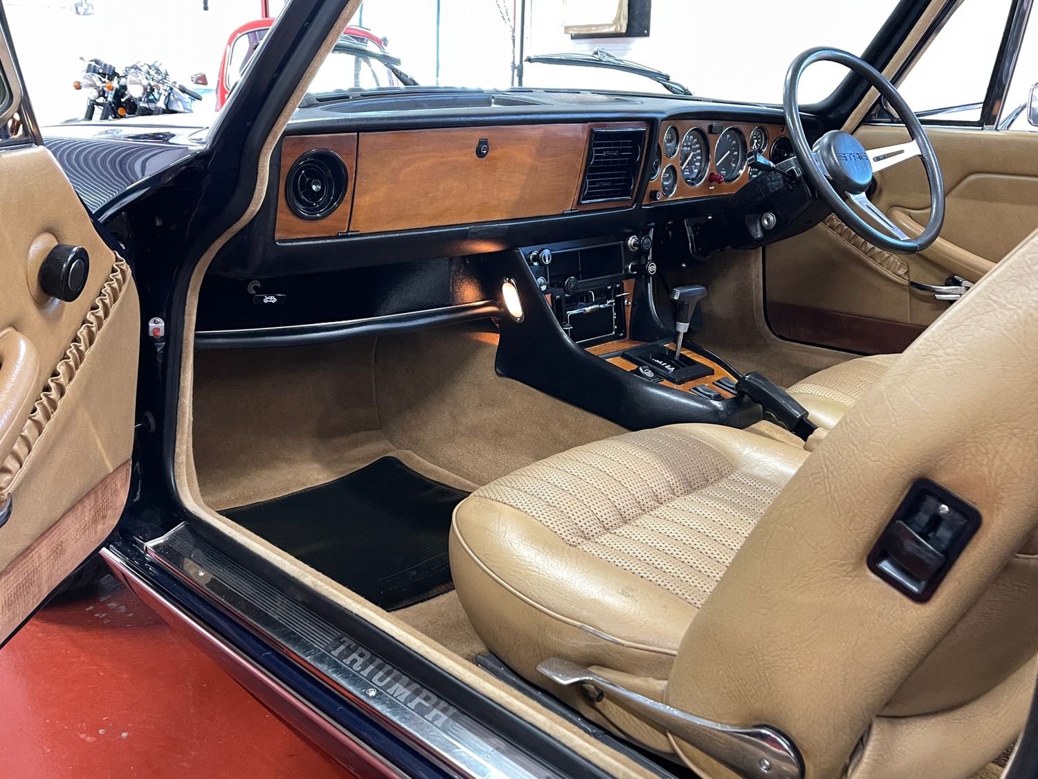 Finished in factory Royal Blue (Code 56). The bodywork was subject to an extensive bare metal restoration by Willow Triumph Limited, Heighington, Darlington. It's clear to see the paintwork is flawless today which is testament to the quality of workmanship carried out in 2016. The panel fit throughout is factory perfect. Most body fittings, trims, lights, bumpers, door handles etc were all refurbished, replaced or re-chromed during the restoration and are still in perfect order today. The navy blue mohair hood and frame assembly was replaced during the restoration and looks as if its never been used. It was decided to keep the coachline and stainless steel sill covers off as the car looked so sharp.