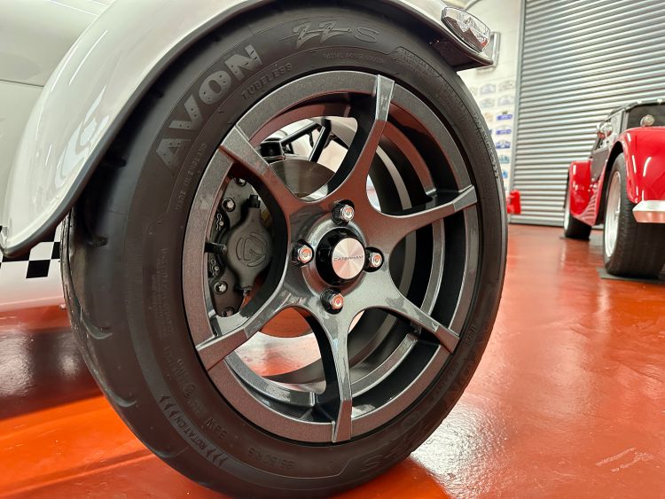 Fitted with unmarked anthracite Orcus 6 spoke superlight 5.90kg alloy wheels, 6.5x15 front and 6.5x13 rear with excellent Avon ZZS 195/50 15 tyres.