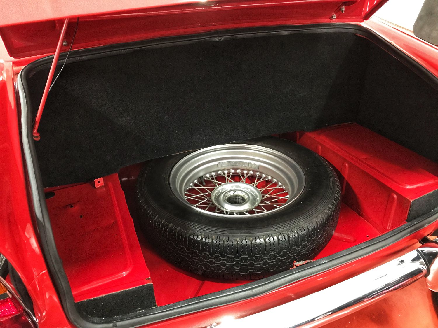The interior is simply wonderful. Being a car built early in the production run it still retains its lovely TR3a style seats, a rare sight they have been fully refurbished in black with white piping as are the matching door cards. The factory original enamelled dashboard is in beautiful condition as is the original multi spoke steering wheel. All switchgear is original and correct as are all the gauges and clocks which give healthy readings. A high quality replacement carpet set has been fitted throughout. The immaculate boot area is carpeted in the matching pile and below the boot floor houses the spare wire wheel, jack and wheel brace.