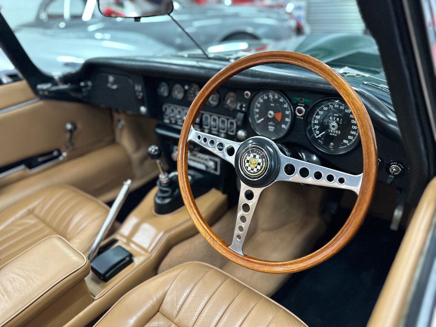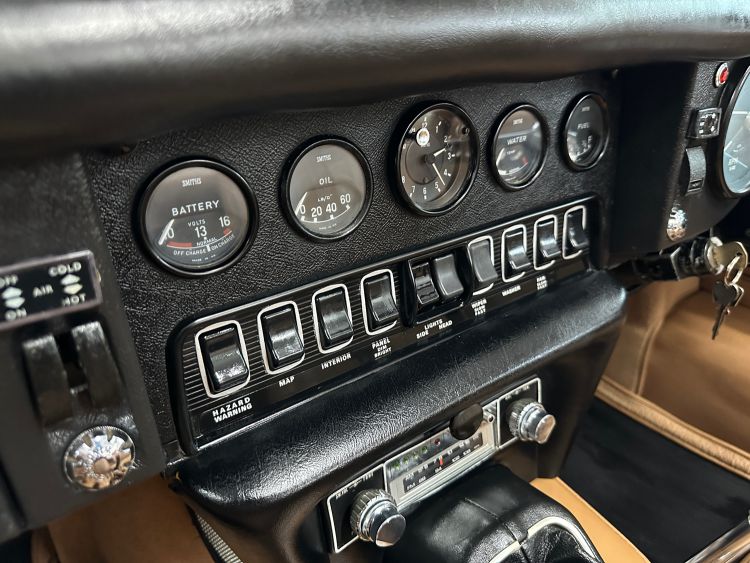 Fully retrimmed new dashboard, new wiring loom, all interior lighting, crystal clear Smiths gauges, switches, analogue clock and electrics work as they should. An original 8 track player, fully refurbished Jaguar wood rim steering wheel and centre boss completes this stunning interior.