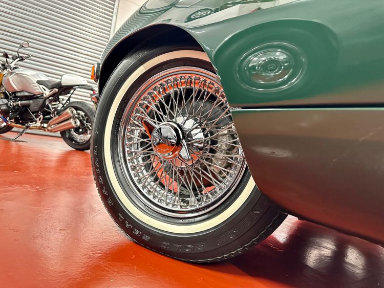 The 5 chrome 72 spoke centre lock hub wire wheels and two eared spinners are in fantastic order. Fitted with all matching quality period Dunlop Gold Series Radial 205/75 R15 white wall tyres which are excellent all round.