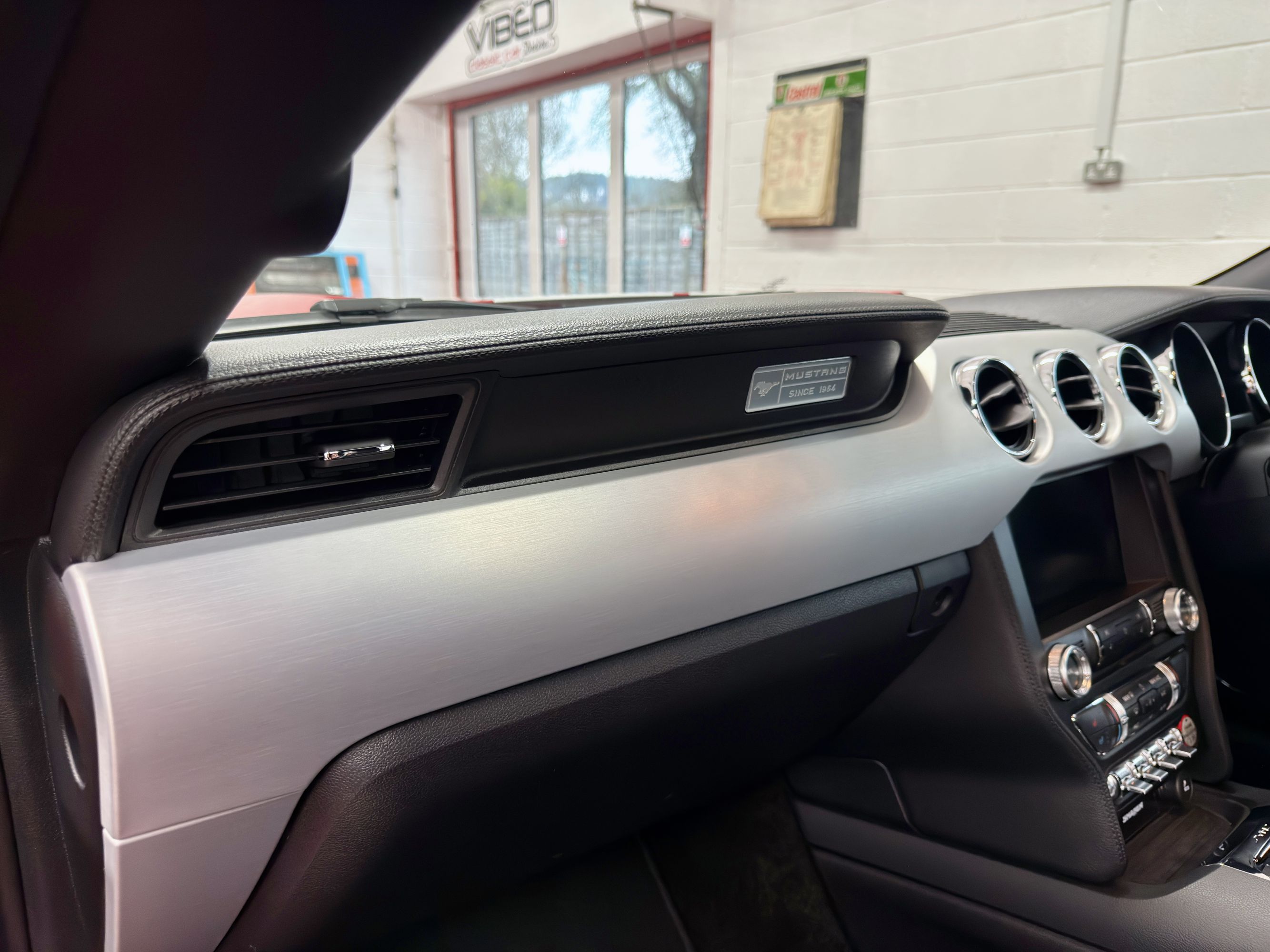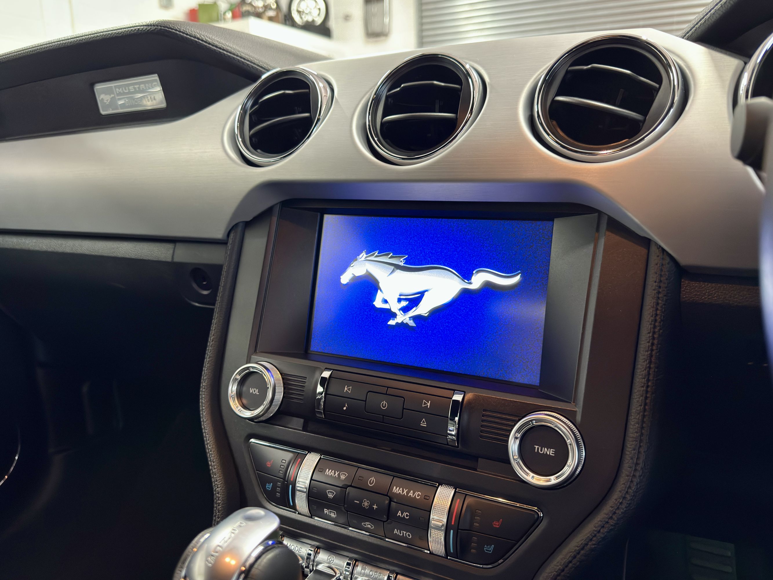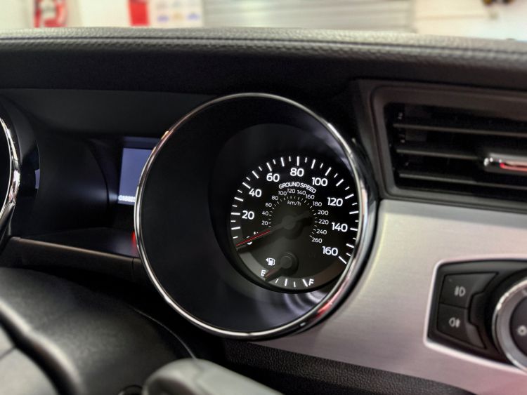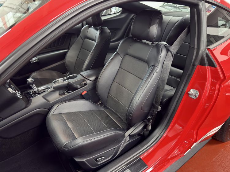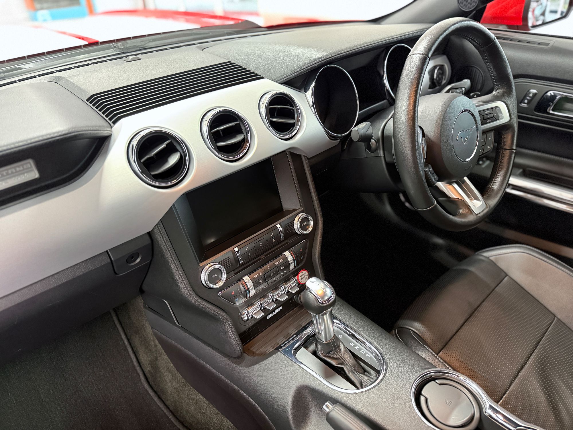 Inside, the 5.0 V8 GT Fastback , you will be presented with a blend of premium materials, cutting edge technology and signature retro styling cues from the 1960's. Large round gauges, a prominent double-brow dashboard and aviation-inspired toggle switches, and a 3-spoke leather steering wheel.