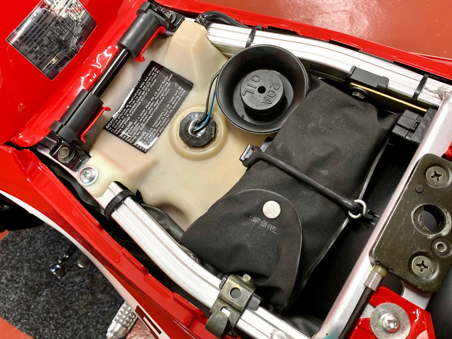Radiator/Cooling - Again examined and found to be in excellent order so re-painted, all hoses replaced with OEM parts, re-zinced clips fitted etc then filled with Motul Pro-Cool Coolant. OEM radiator guard re-painted to OEM finish.