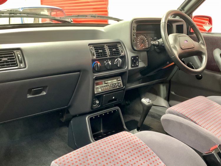 The 1.6 OHC (CVH) MFI (most desirable) Fuel injected engine is crisp and free-revving just as Ford intended for this 'hot hatch'. Producing a lively 105bhp at 6000rpm along with a 0-60 time of 9.6 seconds this is a real fun car to drive and returns a healthy 45.6 mpg as detailed in the official Ford Sales Brochure. The engine is super quiet, starts instantly hot or cold, no smoke or rattles, pulls strong flawlessly through every gear. The super light clutch and 5-speed gearbox operate perfectly as you would expect having only covered a mere 9200 miles. The engine and engine bay is spotless and retains all the original Ford decals.