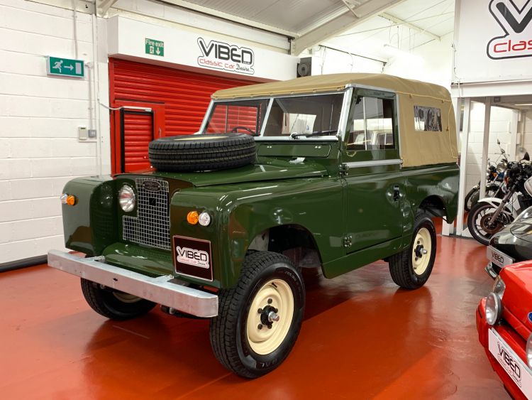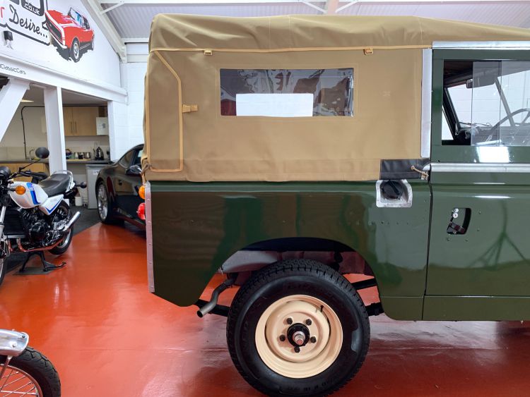 This Series 2 has been finished in the traditional period Bronze Green colour code LRC001. During the restoration of 2018 everything was stripped back to bare alloy, new bulkhead fitted, the paintwork throughout has a very deep uniformed finish inside, outside and underneath. Spare wheel sits on the original bonnet mounting plate. All exterior lighting is new, the original Land Rover plaques front and rear have been refurbished. This series 2 sits on a brand new galvanised chassis; the underside is equally as clean and impressive as the top. A new Exmoor Khaki canvas hood with side and rear screens has been fitted, along with new hood sticks. The hinged front screen operates perfectly... Show winning quality and attention to detail.