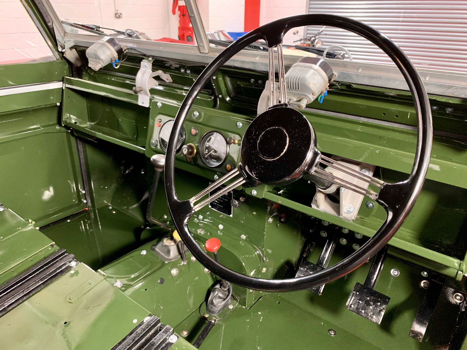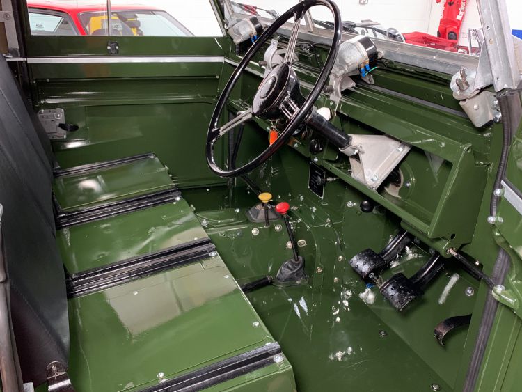 Exactly as Land Rover Intended, minimal but with everything you need. The original seats have been fully restored in correct black vinyl, All gauges refurbished and working correctly, all switch gear operates as it should through the new wiring loom. The complete interior front and rear has been repainted to a high gloss Bronze Green finish and is unmarked. The original banjo steering wheel has been fully restored and looks stunning. Heavy duty Land Rover mats protect the floor in the cab area and the rear fitted out with a tailor made heavy duty ribbed rubber...