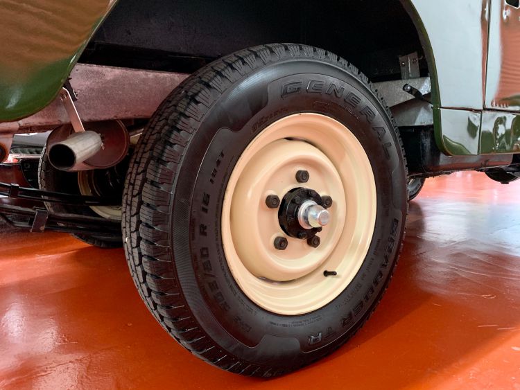 Land Rover factory steel pressed wheels fully refurbished and finished in flawless limestone paint. Shod with brand new all matching premium General Grabber TR tyres. The complete hydraulic drum brake system has been renewed, the handbrake operates with ease and holds firm.