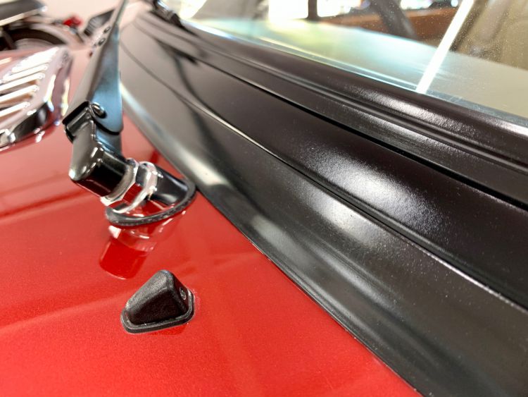 The immediately recognisable hourglass shape of the MG RV8 is finished in Nightfire Red Pearlescent (Code 0916 COQ) this is 1 of only 41 produced in this colour for the UK Market making it very rare indeed. The all original paintwork has a uniformed and deep gloss finish throughout and is flawless, as you would expect from such a low mileage car. The original correct panels produced by Abbey Panels are unmarked and panel fit as per it left the factory as you would expect, no evidence of corrosion as expected with a car that has spent all of its life tucked away indoors. The underside is equally impressive it appears to have never seen rain. The original factory fitted soft top made by Tickford is pristine and rear screen perfectly clear. All original external decals are in perfect order as is the brightwork and lights. The original windscreen still supports the factory etched chassis number and the screen frame as new… A Classic is born.