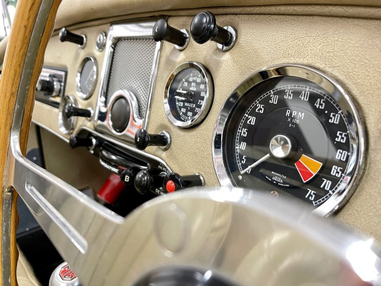 The MGA classic woodrim polished steering wheel & boss are as new. Nice period touches have been added such as a Monte Carlo gear knob, navigator footrest, fire extinguisher, Radiomobile radio and rear storage pocket. All original Jaeger clocks and Smiths gauges work perfectly and have crystal clear glass, the speedo and rev-counter have been fully restored and recalibrated... Stunning