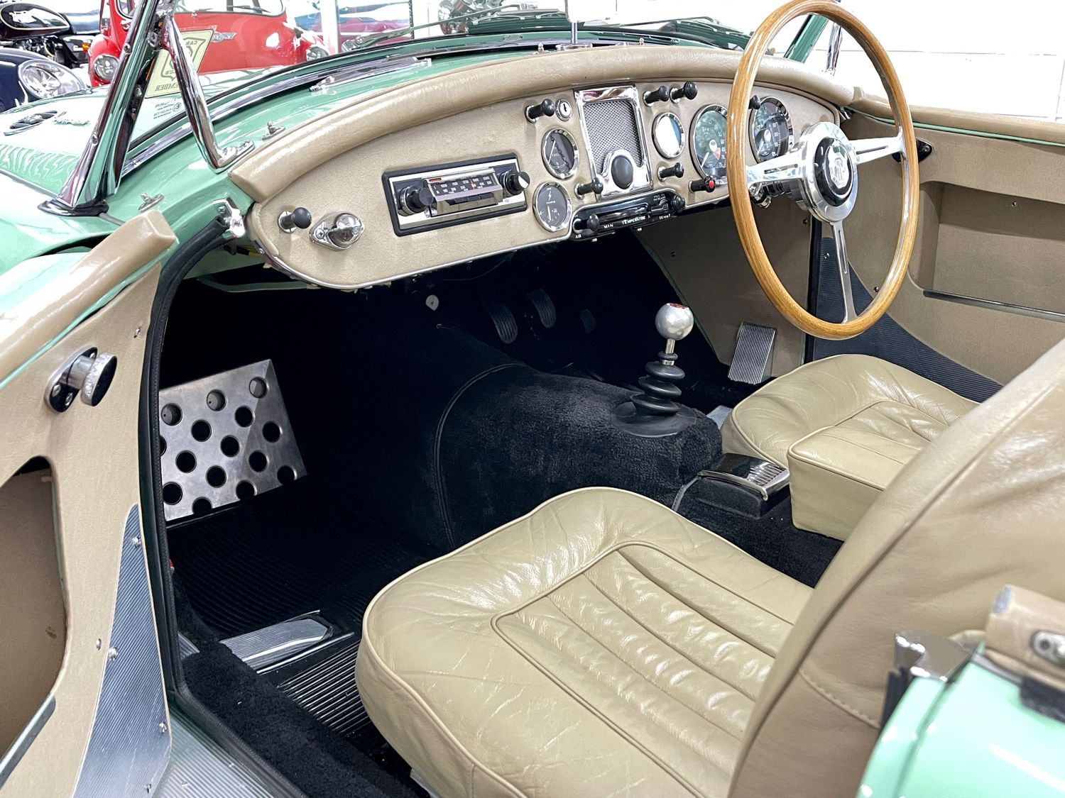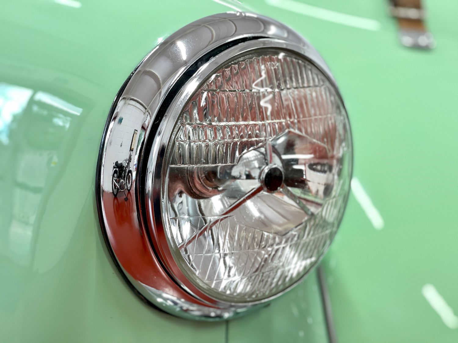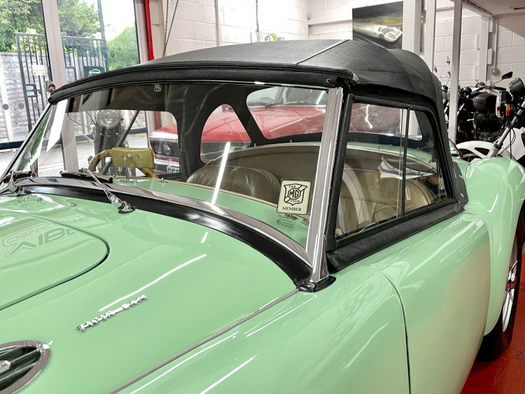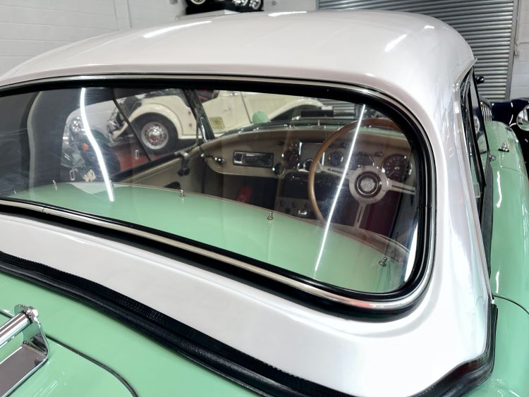 The Ash Green (Code GN.2) paintwork is stunning which is testament to the quality of the bare metal restoration completed 26 years ago. The history file contains 90+ Polaroid pictures of the car before, during and after restoration, the panel fit is excellent as you can see from the pictures, only original panels were used. The bright work is excellent throughout, where possible original items have been restored and retained. The rare factory hard top, black vinyl roof and frame are as new, the matching side screens and full tonneau cover all unmarked.